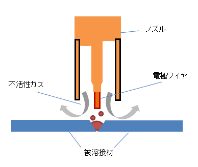 一般的に半自動溶接と称されていますが、正式にはミグ溶接として種別されています。ミグ溶接はアーク溶接の一種で、不活性ガス(アルゴンガス)を使用して、送給ローラーからトーチに送り込まれた、電極と溶加材の役割を持つ電極ワイヤ(チタンワイヤ)を溶かして、被溶接材を溶融する溶接方法です。他のアーク溶接と比較して厚板材(t3.0以上)の溶接が容易にできますが、電極ワイヤ(チタンワイヤ)を溶かす熱量が生じますので、薄板溶接には不向きです。
