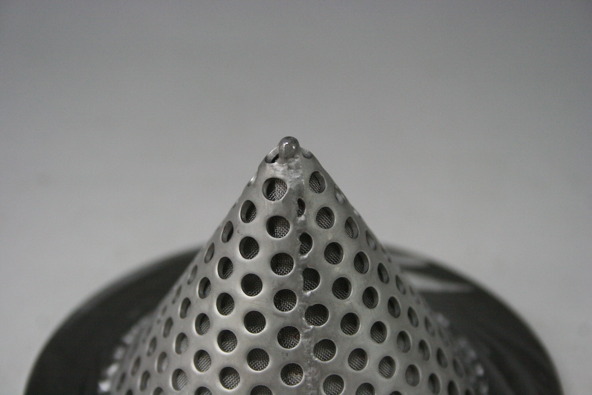 本製品は、図面指定およびメッシュ仕様をもとに、治具を用いて円錐成形を行い、
